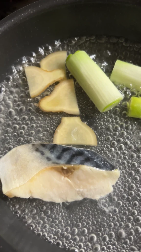 鍋に、生姜、長ねぎ、酒を入れて火にかけ、凍ったままのサバを加えて、ひと煮立ちさせる。