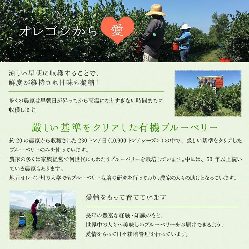 アメリカ・オレゴン州の大自然で育った、大粒で甘みが強い糖度11~13度のデューク種のみを使用。