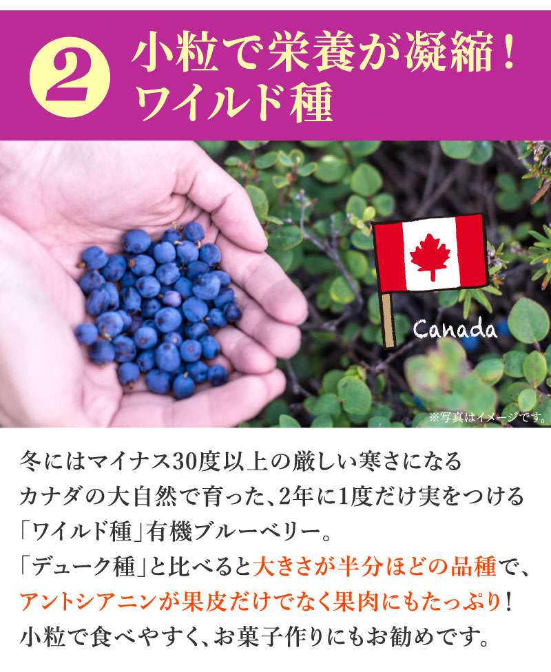 野生種のワイルドブルーベリーは、カナダの大自然で育った、2年に1度だけ実をつける「野生種」。小粒の品種で、アントシアニンが果皮だけでなく果肉にもたっぷり!栄養が一般的な栽培種に比べて豊富という特徴があります。