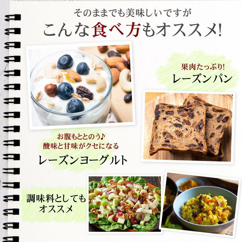 即効性のあるエネルギー源。1日50~60粒程度を目安にお召し上がりください ヨーグルトにレーズンを混ぜたり、果肉たっぷりレーズンパンに。 砂糖代わりにも使える優秀フルーツ!調味料としてもおすすめです。