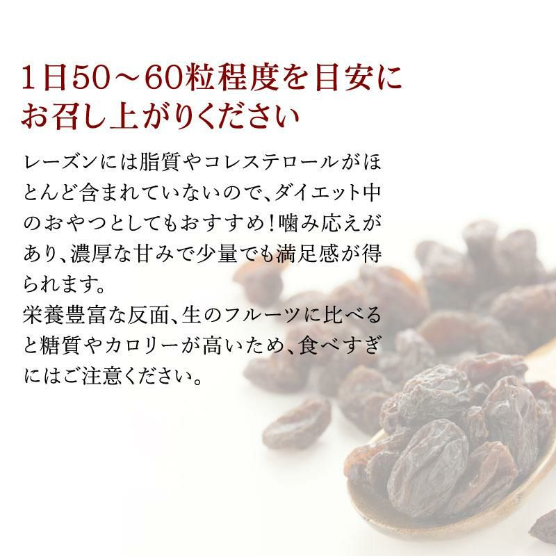 即効性のあるエネルギー源。1日50~60粒程度を目安にお召し上がりください ヨーグルトにレーズンを混ぜたり、果肉たっぷりレーズンパンに。 砂糖代わりにも使える優秀フルーツ!調味料としてもおすすめです。 お客様の声 明細書