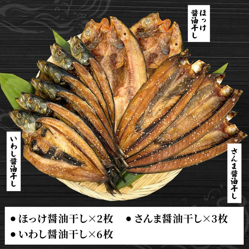 ほっけ醤油干し(約240g)×2、さんま醤油干し(約90g)×3、いわし醤油干し(約90g)×6