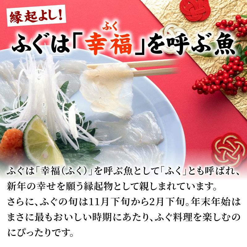 ふぐは「幸福(ふく)」を呼ぶ魚として「ふく」とも呼ばれ、新年の幸せを願う縁起物として親しまれています。さらに、ふぐの旬は11月下旬から2月下旬。年末年始はまさに最もおいしい時期にあたり、ふぐ料理を楽しむのにぴったりです。