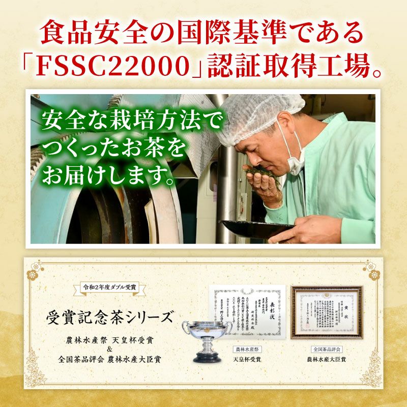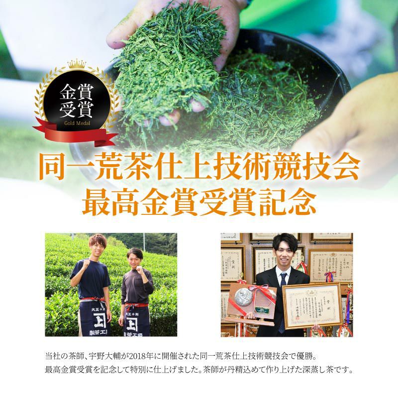 佐々木製茶株式会社の茶師、宇野大輔が2018年に開催された同一荒茶仕上技術競技会で優勝。最高金賞受賞を記念して特別に丹精込めて作り上げた深蒸し茶です。