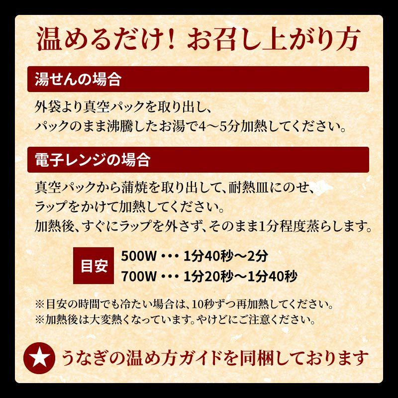 ・食べ盛りのお子様、スポーツ前、ご年配の方にも、お湯で温めるだけのレトルトパックで簡単手軽な調理で、ふっくらやわらか、トロけるような美味しい蒲焼をいつでも安心して召し上がっていただけます。また、うなぎ蒲焼は消化吸収が良く、高タンパク、ビタミン豊富なスタミナ健康食であることから、「土用の丑の日」は勿論のこと、スポーツ競技やここ一番の「頑張り」をサポートする「勝負飯」として是非オススメ致します。