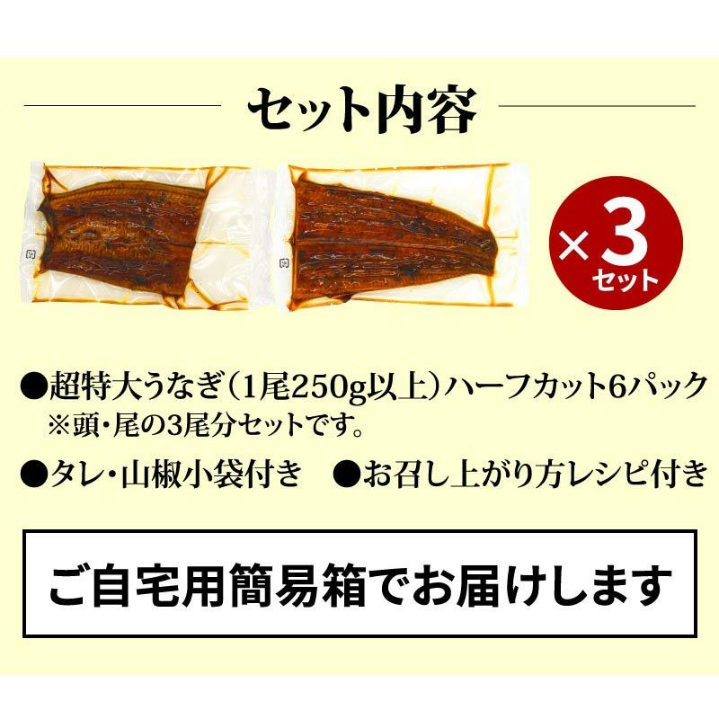 うなぎ蒲焼(1尾250g以上)の、頭・尾の1尾分が3セット入ります。1尾で2人前以上のボリュームです。