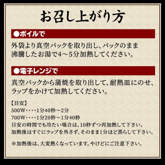 うなぎ(国産・ニホンウナギ)、しょうゆ(小麦・大豆を含む)、みりん、発酵調味料、砂糖/増粘剤(加工でん粉)