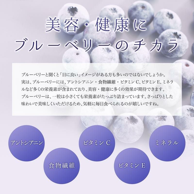 ブルーベリーと聞くと「目に良い」イメージがある方も多いのではないでしょうか。実は、ブルーベリーには、アントシアニン・食物繊維・ビタミンC、ビタミンE、ミネラルなど多くの栄養素が含まれており、美容・健康に多くの効果が期待できます。ブルーベリーは、一粒は小さくても栄養素がたっぷり詰まっています。さっぱりとした味わいで美味しくいただけるため、気軽に毎日食べられるのが嬉しいですね。