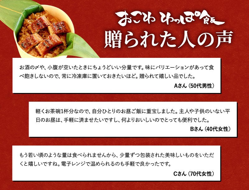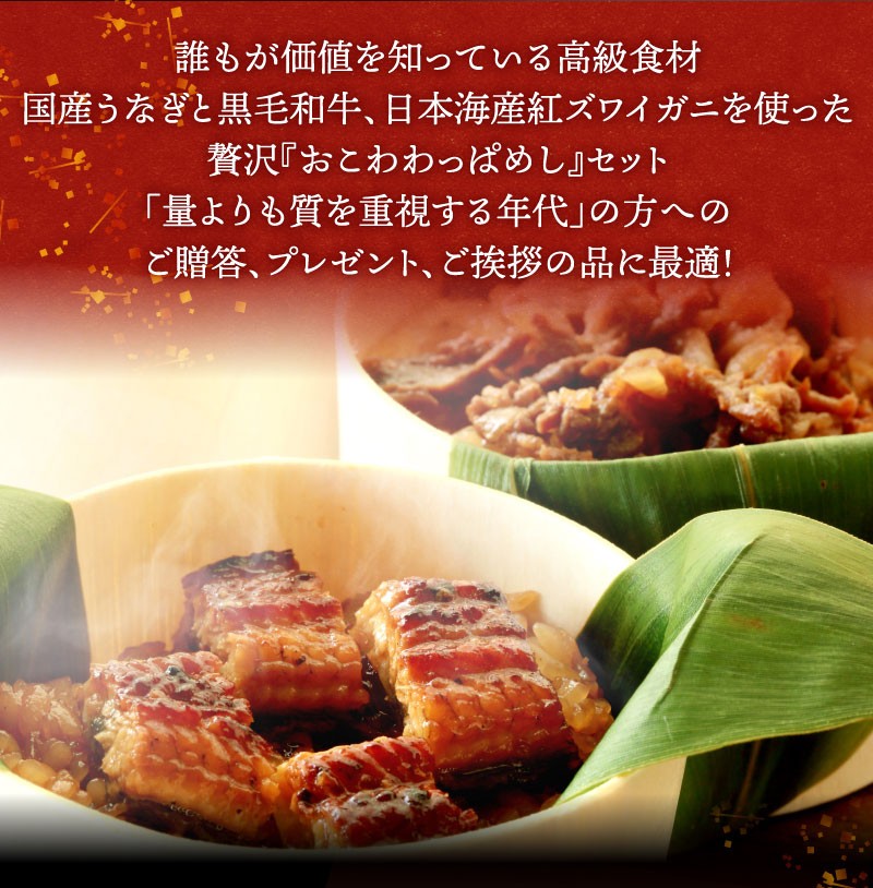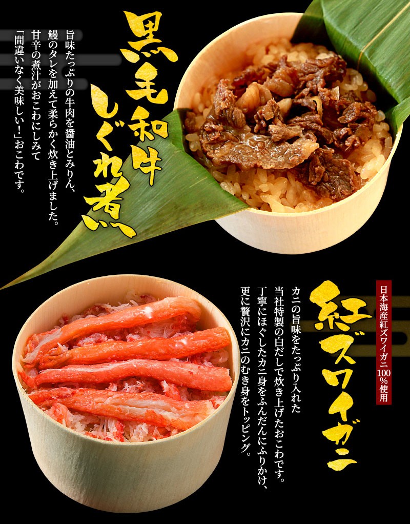 うなぎおこわ110g×2食、かにおこわ110g×2食、牛しぐれおこわ110g×2食 |