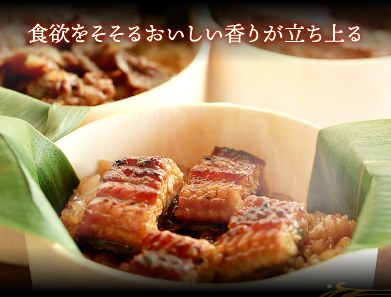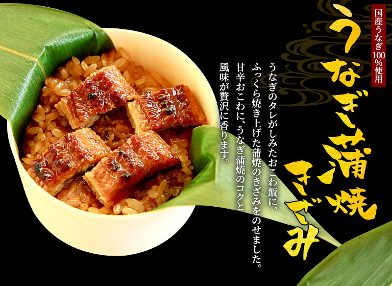 甘辛おこわに、うなぎ蒲焼のコクと 風味が贅沢に香ります。