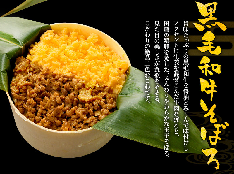 旨味たっぷりの黒毛和牛を醤油とみりんで味付けし、アクセントに生姜を混ぜこんだ牛肉そぼろと、国産の鶏卵を蒸した、ふんわりやわらかな玉子そぼろ。