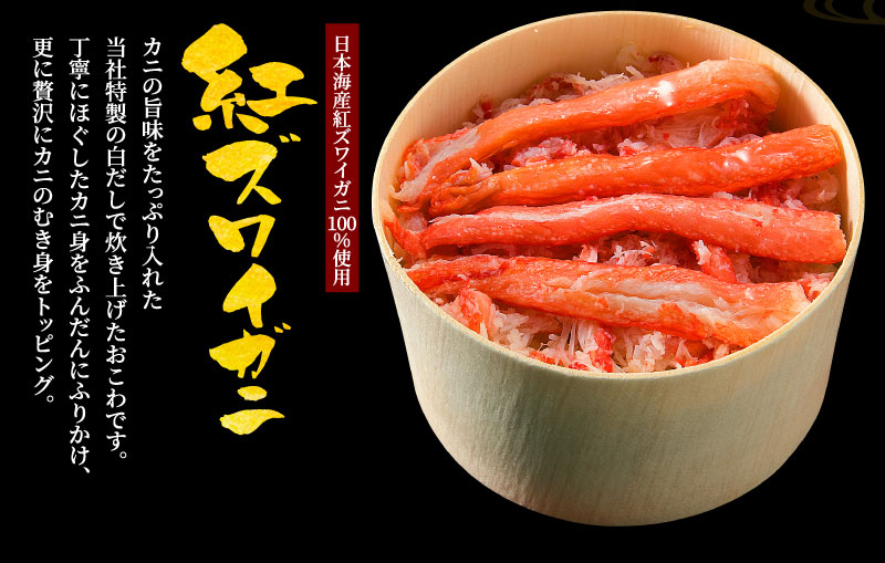 カニの旨味たっぷり!特製白だしで炊き上げたおこわです。 丁寧にほぐしたカニ身をふんだんにふりかけ、更にカニのむき身をトッピング。贅沢なカニの旨味と魚介やこんぶ、シイタケの旨みだしがおこわに染みわたっています。