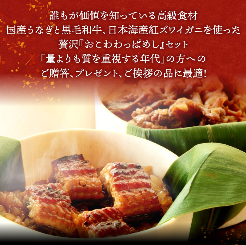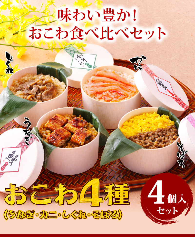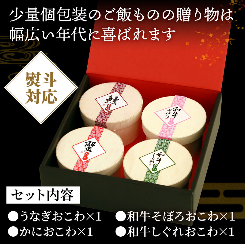 おこわ4種食べ比べセット うなぎ・かに・牛しぐれ・牛そぼろおこわ(4個入り) |