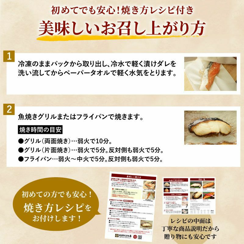 酒粕漬け、西京味噌漬けの切身は、72時間しっかり漬け込んでからお届けします。こだわりの酒粕や西京味噌のうま味を、魚にしっかり染み込ませた商品化です。焼く際に、漬け魚は非常に焦げやすいのですが、当店の漬け魚は、酒粕や味噌をふき取ってもしっかり味が残ります。
