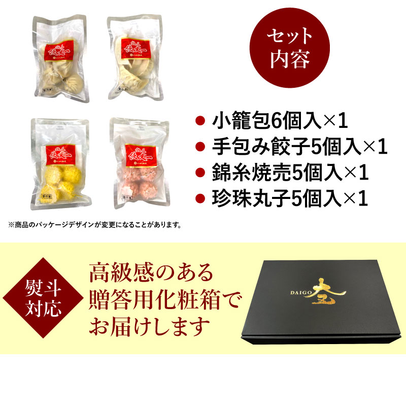 鉄人 陳建一のオリジナルメニュー、中華点心セットです。赤坂四川飯店の人気メニュー「小籠包」や「手包み餃子」など、ご家庭で本格中華が味わえます。スープがたっぷりと入った小籠包、外はカリッともっちりジューシーな手包み餃子、野菜が入った団子をもち米で包んだ見た目も華やかな珍珠丸子など、4種類21個入った点心セットです。中華オードブルとしてホームパーティーや、飲茶にオススメ。また、お誕生日の贈り物にも喜ばれます。