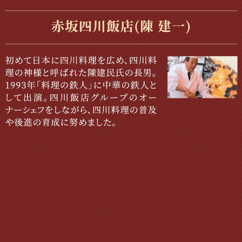 初めて日本に四川料理を広め、四川料理の神様と呼ばれた陳建民氏の長男。1993年「料理の鉄人」に中華の鉄人として出演。四川飯店グループのオーナーシェフをしながら、四川料理の普及や後進の育成に努めました。