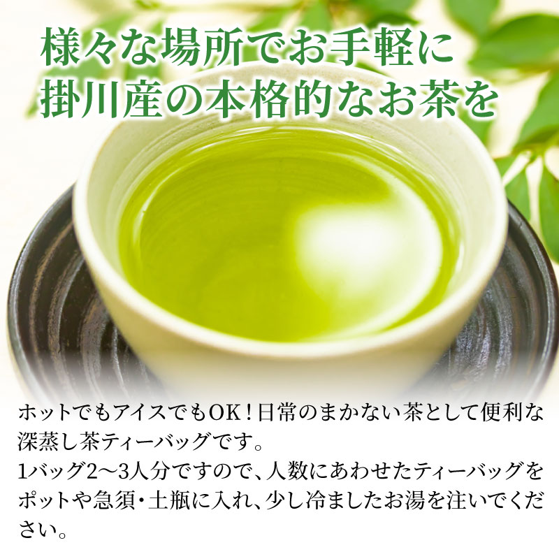 静岡県掛川市の老舗「佐々木製茶株式会社」から産地直送。 ホットでもアイスでもOKの深蒸し茶ティーバッグです。日常のまかない茶として便利な、ポット用/ひもなしタイプです。