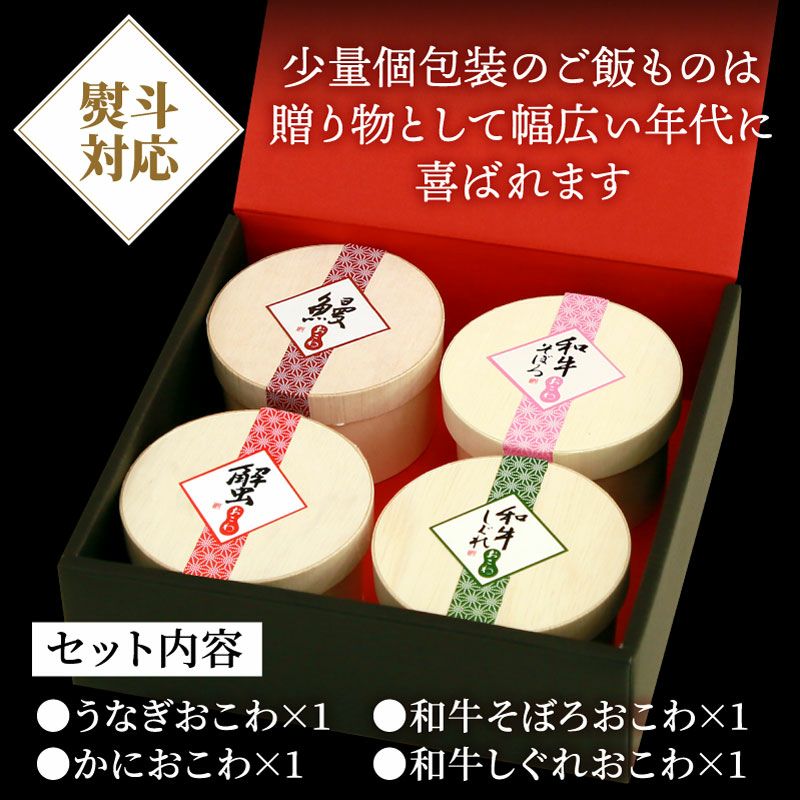 おこわ4種食べ比べセット うなぎ・かに・牛しぐれ・牛そぼろおこわ(4個入り) |