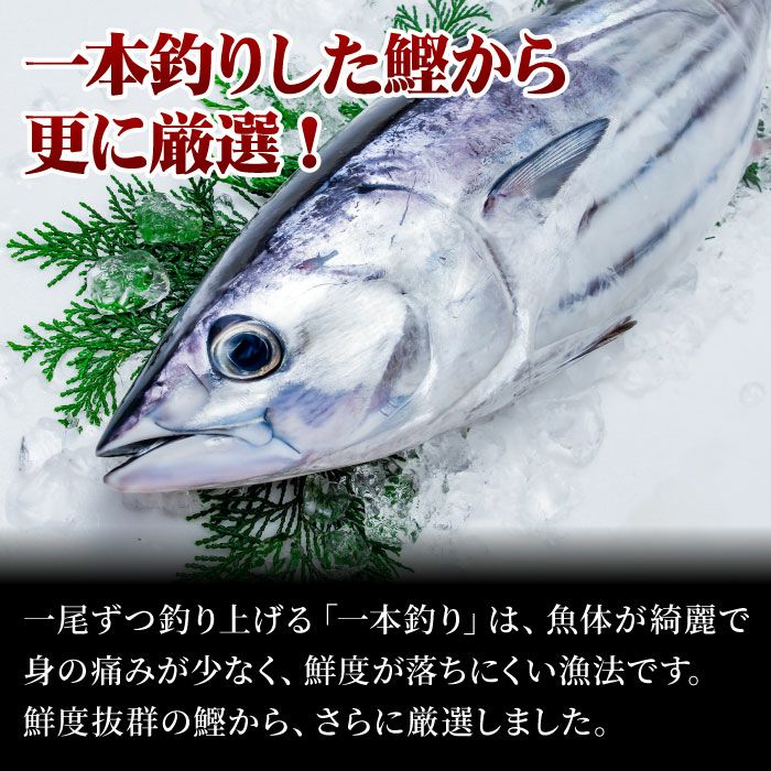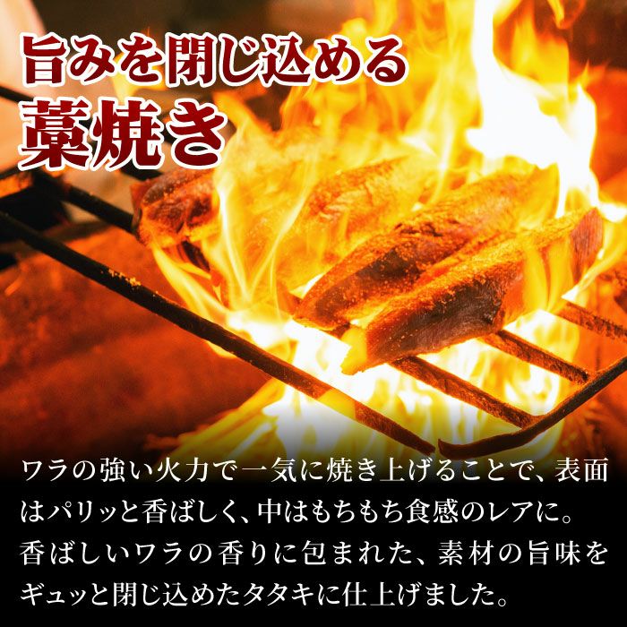 商品説明 一尾ずつ釣り上げる「一本釣り」は、魚体が綺麗で身の痛みが少なく、鮮度が落ちにくい漁法です。鮮度抜群の鰹から、さらに良い部位を厳選。ワラの強い火力で一気に焼き上げることで、表面はパリッと香ばしく、中はもちもち食感のレアに。香ばしいワラの香りに包まれた、素材の旨味をギュッと閉じ込めたタタキに仕上げました。