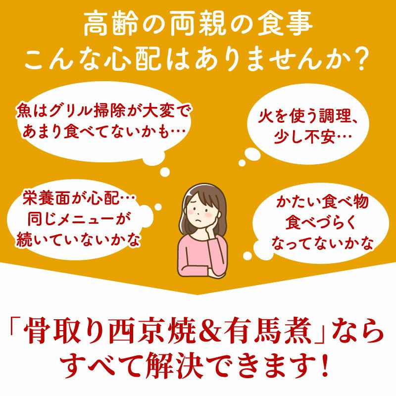 温めるだけ!お子様やご高齢者も安心!家族みんなで味わうお魚惣菜 楽天ランキング1位 高齢の両親の食事、こんな心配はありませんか? 高齢の両親の食事、こんな心配はありませんか? 有名ホテルや料亭が認めた本格魚惣菜「西京焼き」「有馬煮」 骨取りだから子供や高齢者も安心! 忙しい主婦や一人暮らしに嬉しい!レンジで60秒 簡単調理 冷めても柔らかい!お弁当にも最適 お客様からの声 銀鮭 西京焼き、銀ひらす  西京焼き カレイ  西京焼き、赤魚  有馬煮 美味しい温め方 骨取り焼魚・煮魚 セット内容 のし対応 高級料亭の味をご家庭でお楽しみください