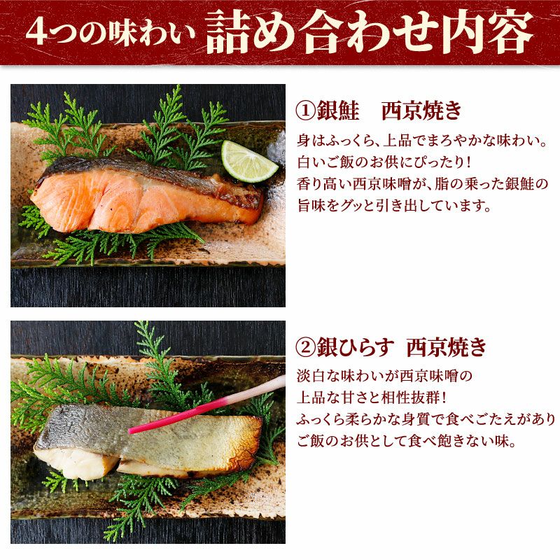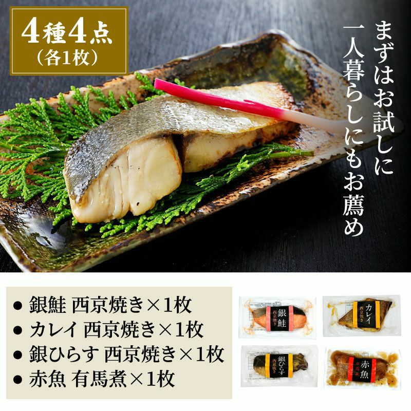 銀鮭 西京焼(焼前 約70g)×1枚、銀ひらす 西京焼(焼前 約70g)×1枚、カレイ 西京焼(焼前 約70g)×1枚、赤魚 有馬煮(焼前 約70g)×1枚