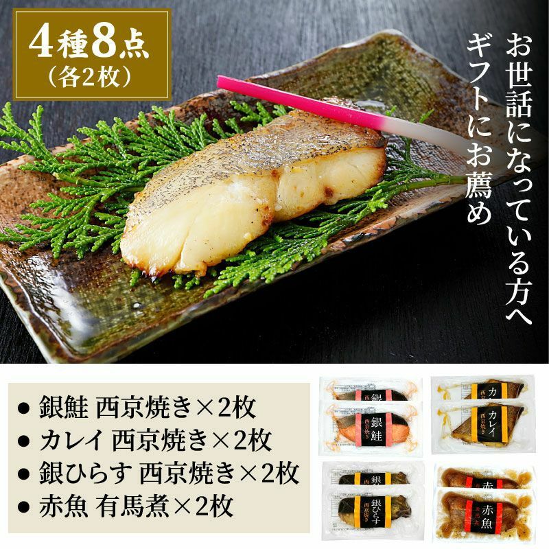銀鮭 西京焼(焼前 約70g)×2枚、銀ひらす 西京焼(焼前 約70g)×2枚、カレイ 西京焼(焼前 約70g)×2枚、赤魚 有馬煮(焼前 約70g)×2枚