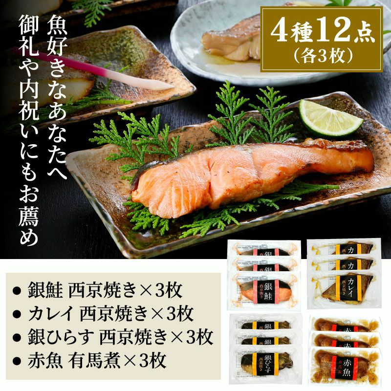 銀鮭 西京焼(焼前 約70g)×3枚、銀ひらす 西京焼(焼前 約70g)×3枚、カレイ 西京焼(焼前 約70g)×3枚、赤魚 有馬煮(焼前 約70g)×3枚