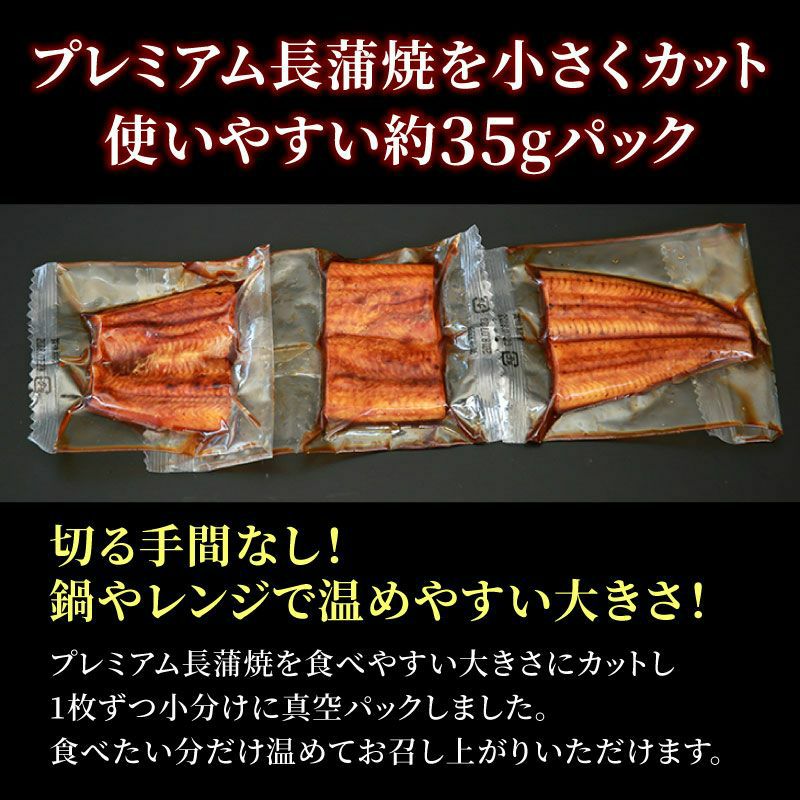 ふっくら柔らか!大五うなぎ工房オリジナル製法による柔らかな食感。プレミアム長蒲焼を食べ易い大きさ(35~40g)にカットし、1枚づつ小分けに真空パックしました。ミニカットは使い勝手が便利で、切る手間もなく、鍋やレンジで温めやすい大きさなので、食べたい分だけを温めてお召し上がりいただけます。箸で「すーっ」と簡単に切れ、ふっくらご飯と最高のマッチング。うなぎが苦手な方からでも、「やわらか~い」と好評をいただいています。特に女性やシニアの方から大絶賛されリピーターが多い商品です。
