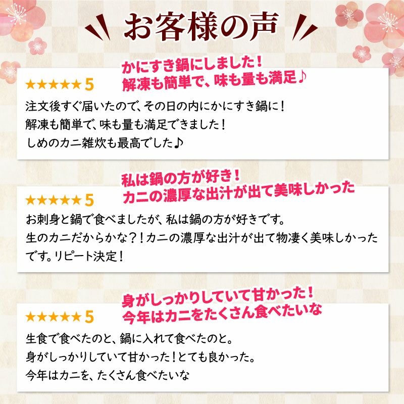 お刺身OK!流水解凍するだけで食べられる、鮮度抜群の特大生ズワイガニ