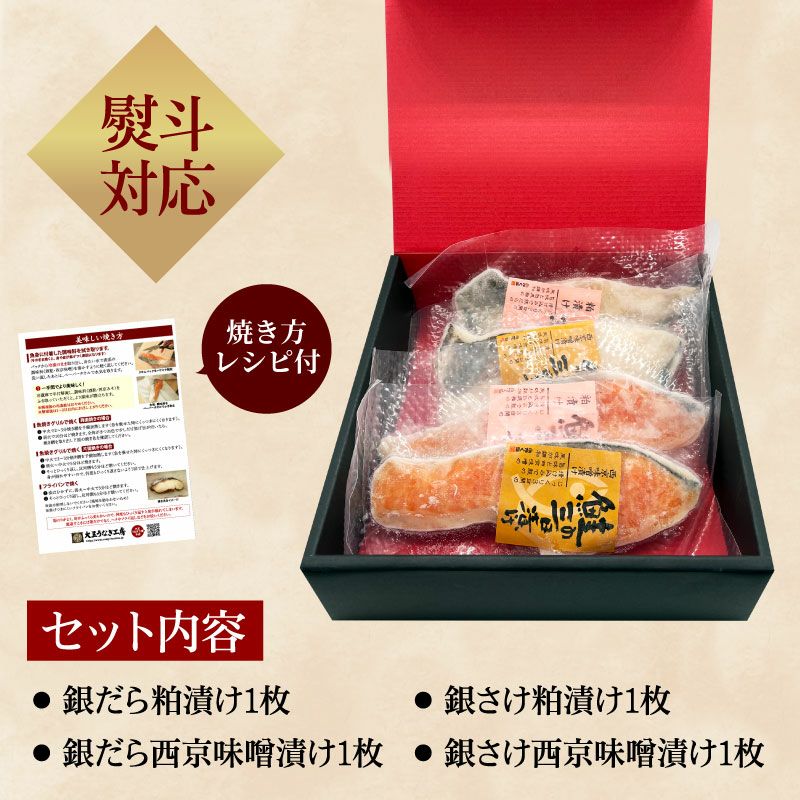 中でも人気の高い「銀だら」、「銀さけ」を、漬け魚の定番「粕漬け」と「西京味噌漬け」にしたものをチョイス。各1切ずつ、4枚を詰合せにしました。