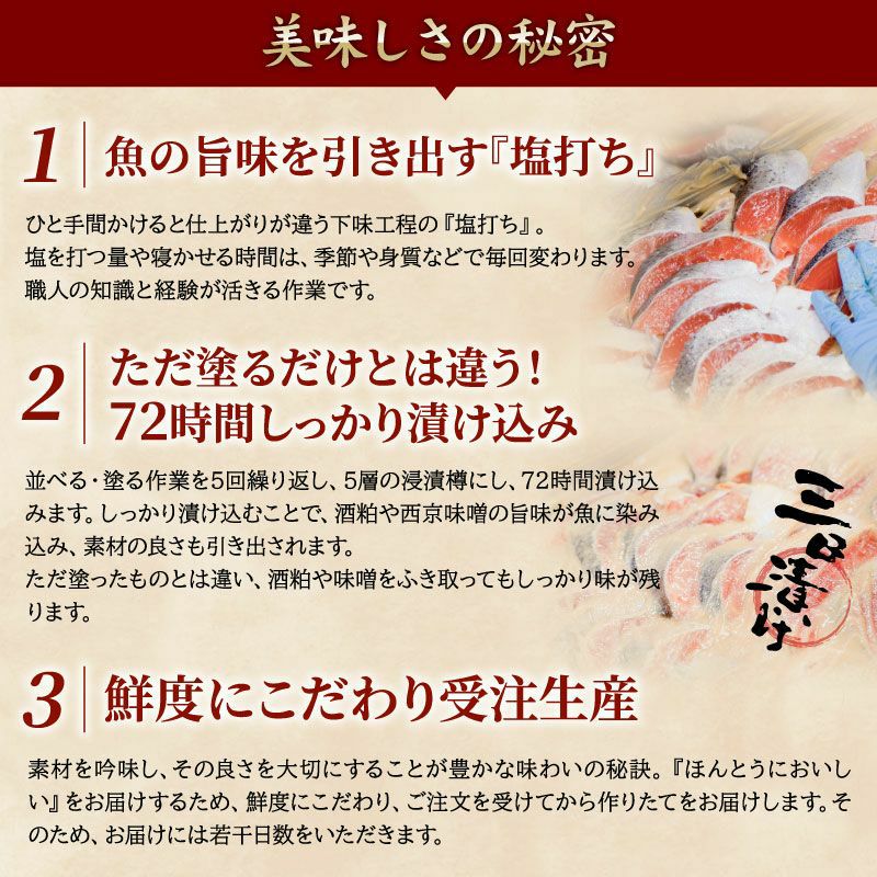酒粕漬け、西京味噌漬けの切身は、72時間しっかり漬け込んでからお届けします。こだわりの酒粕や西京味噌のうま味を、魚にしっかり染み込ませた商品化です。焼く際に、漬け魚は非常に焦げやすいのですが、当店の漬け魚は、酒粕や味噌をふき取ってもしっかり味が残ります。
