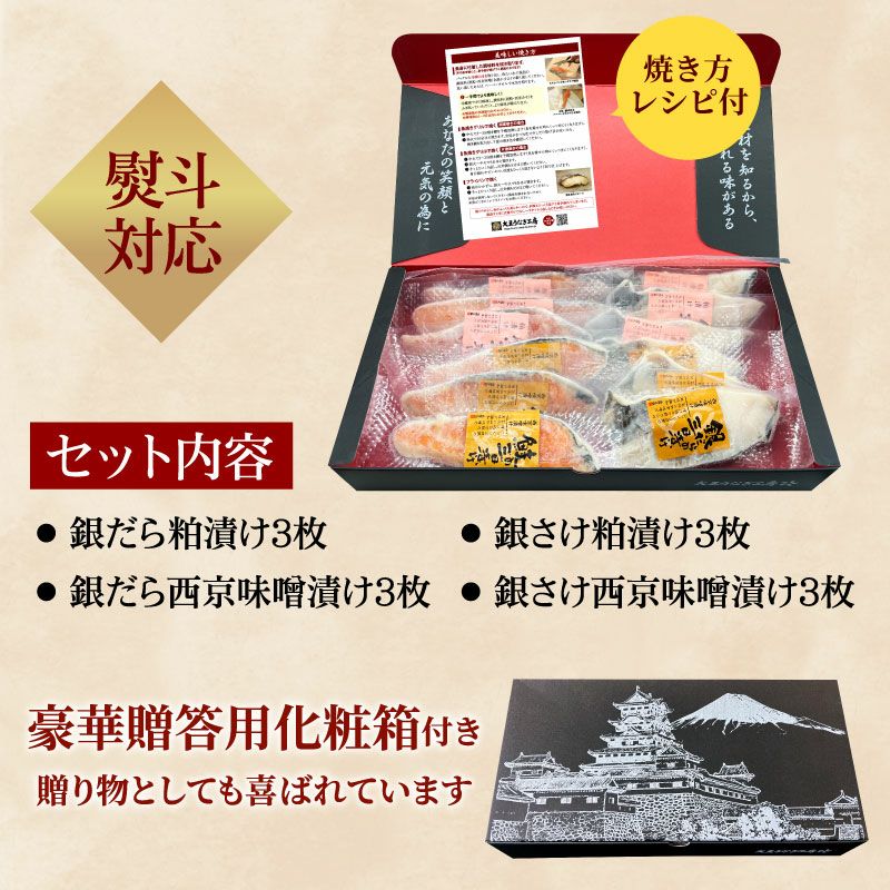 ●銀さけ西京味噌漬け 約80g×3切れ ●銀さけ粕漬け 約80g×3切れ ●銀だら西京味噌漬け 約70g×3切れ ●銀だら粕漬け 約70g×3切れ