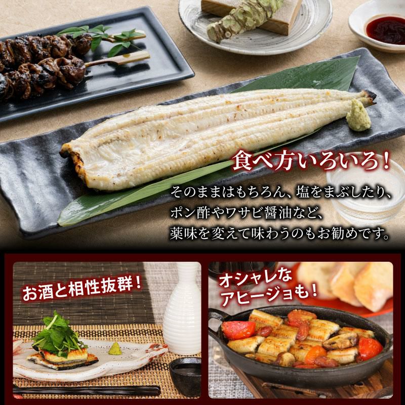 白焼きはタレをつけて焼かないため、うなぎ本来の香り、旨みの深さを存分に味わえます。脂のり抜群な極上国産うなぎを熟練職人が丹念に焼き上げました。そのままはもちろん、塩をまぶしたり、ポン酢やワサビ醤油など、薬味を変えて味わうのもお勧めです。