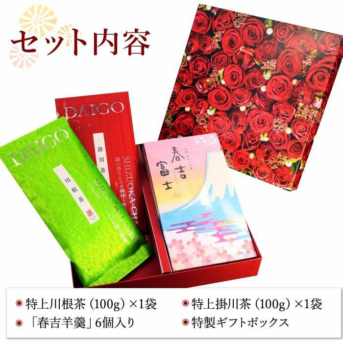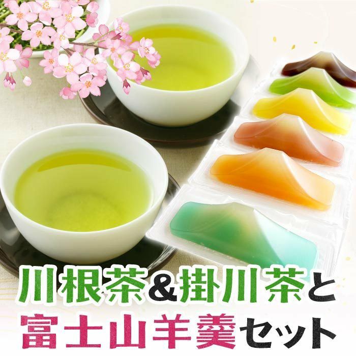 飲み比べが楽しめる川根茶と掛川茶、お茶請けにピッタリな色とりどりの一口羊羹「春吉富士」を、花束のように豪華なギフトケースに詰め合わせたお茶と和菓子セット。