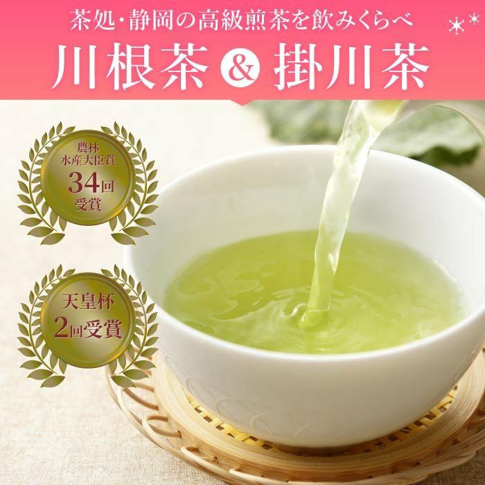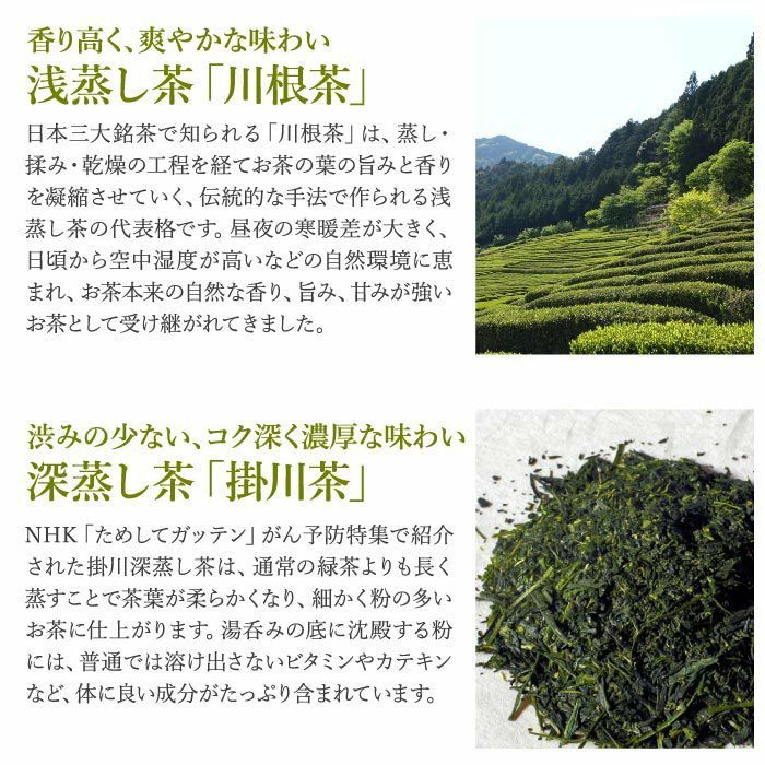 日本三大銘茶で知られる香り高く爽やかな味わいの「川根茶」と、健康効果で話題の渋みの少ない、コク深く濃厚な味わいの「深蒸し掛川茶」。茶園の土づくりからこだわる、創業100年お茶どころ静岡県掛川市の老舗のお茶屋さん厳選の特上煎茶です。