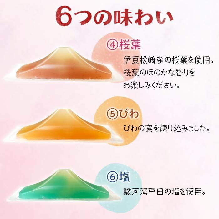 末広がりで縁起のいい、ひとくちサイズの富士山羊羹「春吉富士」は、伝統の技と富士山の伏流水でひとつひとつ丁寧につくりました。小豆、青柚子、ニューサマーオレンジ、桜葉、びわ、塩の6つの味わい。お茶の時間を華やかに彩る、材料からこだわった風味豊かな一口羊羹です。