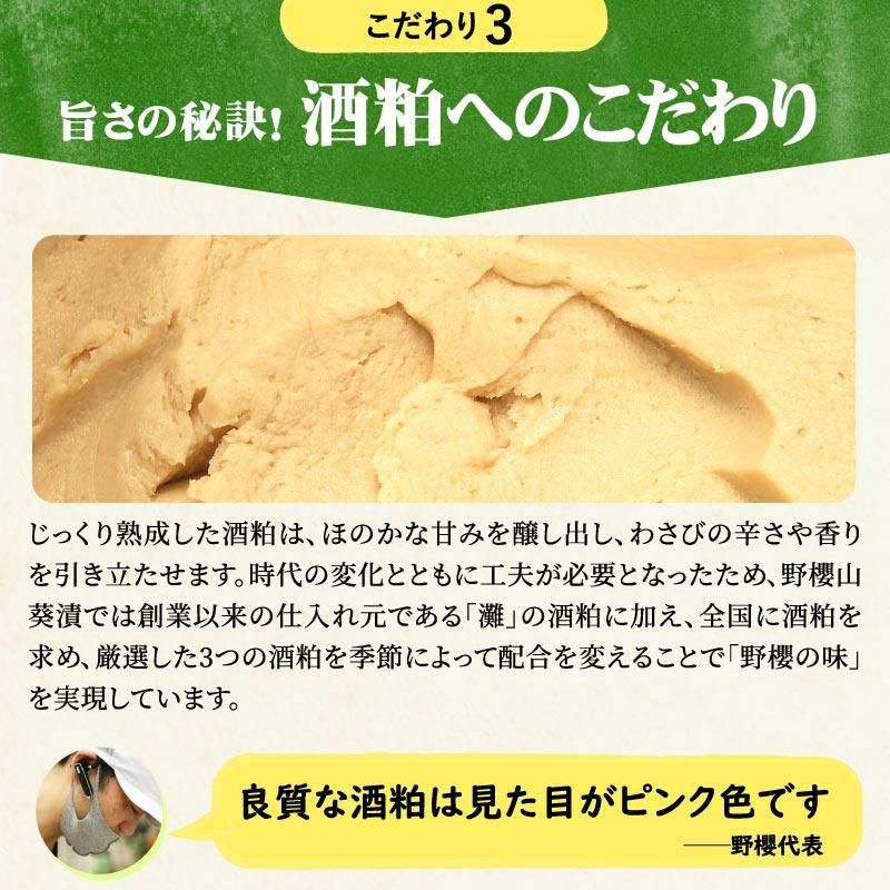 じっくり熟成した酒粕は、ほのかな甘みを醸し出し、わさびの辛さや香りを引き立たせます。時代の変化とともに工夫が必要となったため、野櫻山葵漬では創業以来の仕入れ元である「灘」の酒粕に加え、全国に酒粕を求め、厳選した3つの酒粕を季節によって配合を変えることで「野櫻の味」を実現しています。