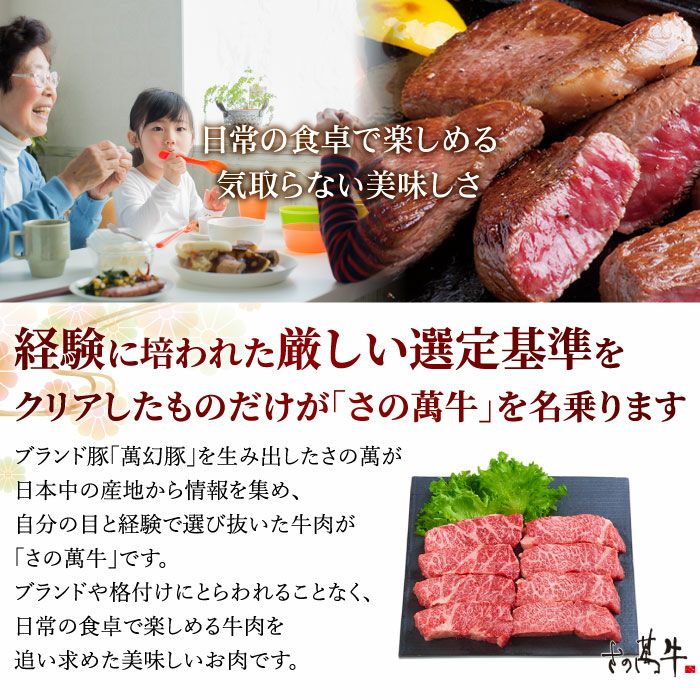 商品説明 ブランド豚「萬幻豚」を生み出したさの萬が、日本中の産地から情報を集め、自分の目と経験で選び抜いた牛肉が「さの萬牛」です。ブランドや格付けにとらわれることなく、日常の食卓で楽しめる牛肉を追い求めた美味しいお肉です。