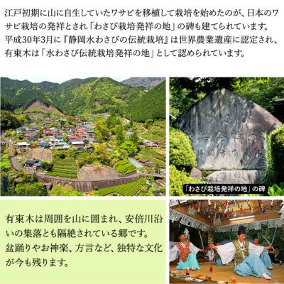 わさび栽培発祥の地「有東木」の栽培農家から直送。標高600m、夏でも冷たい水が流れ、本わさびの生育に厳しい環境で栽培された本わさびです。ギュッと身が詰まっていて、濃厚な香りと上品な辛味をお楽しみいただけます。