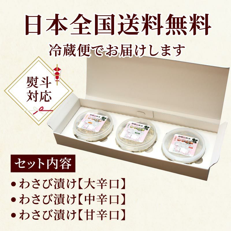 他の画像を見る 静岡産の本わさびを贅沢に使った手作りワサビ漬け。贈り物にもお勧め こだわり店主の手作りわさび漬け 3つの辛さを食べ比べセット(大辛口60g、中辛口70g、甘辛口75g) 野櫻本店 のし対応 クール便でお届け 販売価格 ¥ 4,580 税込 詳細を見る お気に入りに登録する