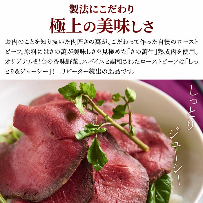 他の画像を見る 肉匠さの萬がこだわって作った自慢のローストビーフ 肉匠さの萬 こだわり仕立て熟成ローストビーフ280g のし対応 クール便でお届け 販売価格 ¥ 8,600 税込 詳細を見る お気に入りに登録する
