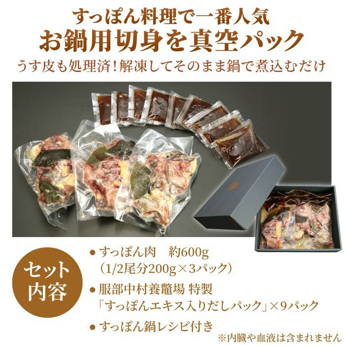 すっぽん料理で一番人気のお鍋用切身を真空パックしてあります。うす皮も処理済なので、解凍してそのまま鍋で煮込むだけです。服部中村養べつ場特製「すっぽんエキス入りだしパック」もお付けします。すっぽん鍋のレシピ付き。
