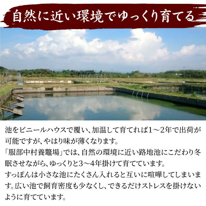 自然の原料だけを使った独自開発の飼料を与え、ゆっくりと3~4年、自然に近い環境で育てているので、天然のすっぽんに比べても身質が柔らかく臭みもありません。良質な脂肪とコクのある味わいを持った「服部のすっぽん」は、全国の高級料理店で高い評価を受けています。