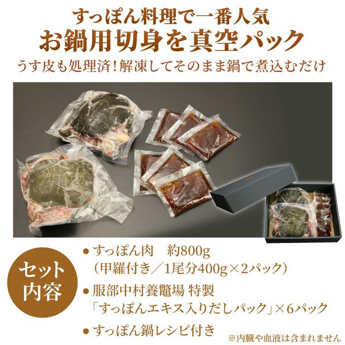 すっぽん料理で一番人気のお鍋用切身を真空パックしてあります。うす皮も処理済なので、解凍してそのまま鍋で煮込むだけです。服部中村養べつ場特製「すっぽんエキス入りだしパック」もお付けします。すっぽん鍋のレシピ付き。