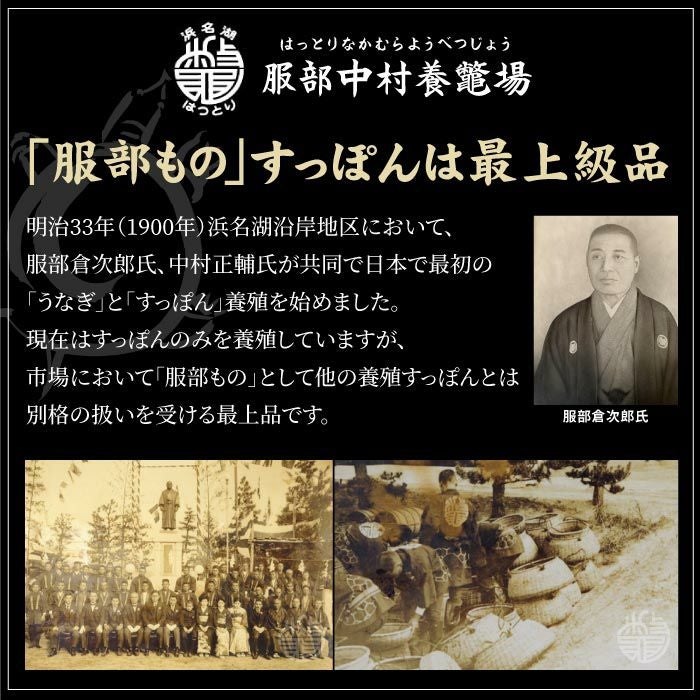 自然の原料だけを使った独自開発の飼料を与え、ゆっくりと3~4年、自然に近い環境で育てているので、天然のすっぽんに比べても身質が柔らかく臭みもありません。良質な脂肪とコクのある味わいを持った「服部のすっぽん」は、全国の高級料理店で高い評価を受けています。
