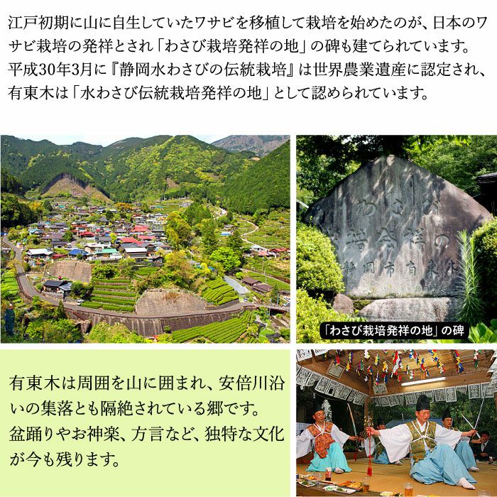わさび栽培発祥の地「有東木」の栽培農家から直送。標高600m、夏でも冷たい水が流れ、本わさびの生育に厳しい環境で栽培された本わさびです。ギュッと身が詰まっていて、濃厚な香りと上品な辛味をお楽しみいただけます。