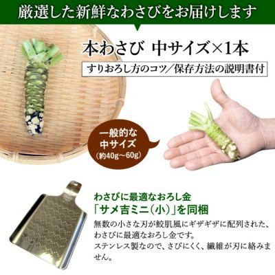 わさび栽培発祥の地「有東木(うとうぎ)」の本わさび<中サイズ>1本とわさびに最適なおろし金「サメ吉ミニ(小)」のセット |