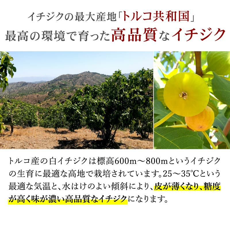 トルコ産の白イチジクは標高600m~800mというイチジクの生育に最適な高地で栽培されています。25~35℃という最適な気温と、水はけのよい傾斜により、皮が薄くなり、糖度が高く味が濃い高品質なイチジクになります。