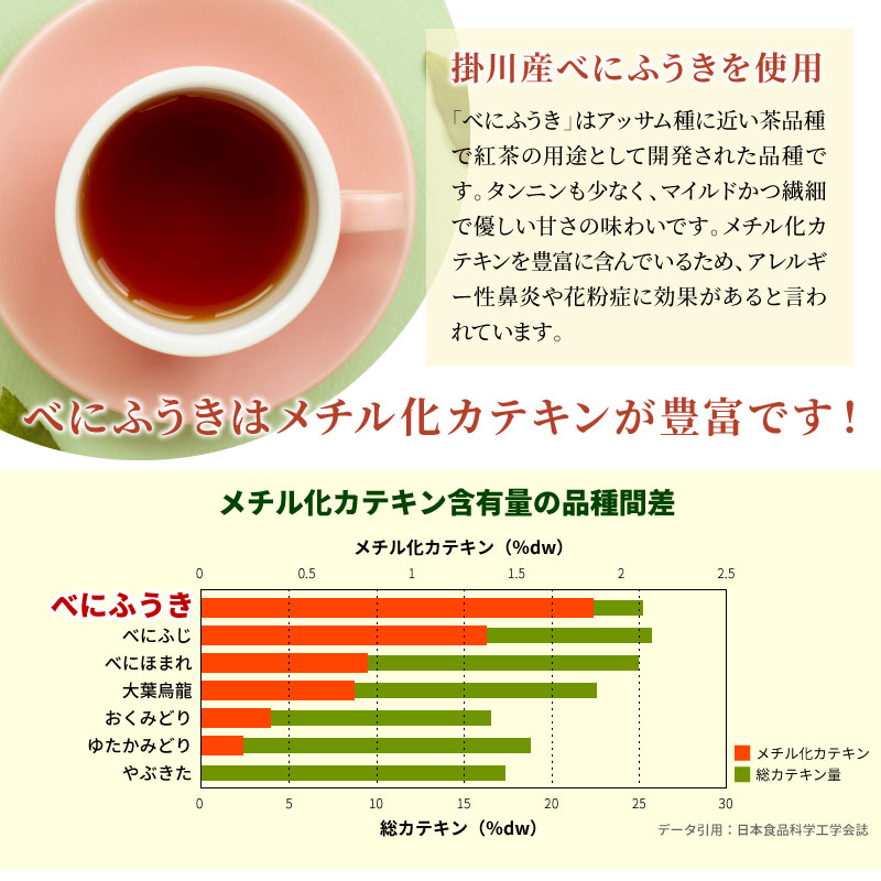 「べにふうき」はアッサム種に近い茶品種で紅茶の用途として開発された品種です。美しい茶色のお茶になります。インドの紅茶のような自己主張が激しい渋みや香りも少なく、マイルドな繊細で優しい甘さの味わいになります。タンニンも少ないのが特徴です。「べにふうき」はメチル化カテキンを豊富に含んでいるため、アレルギー性鼻炎や花粉症に効果がるといわれます。