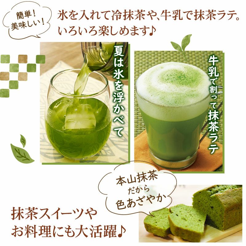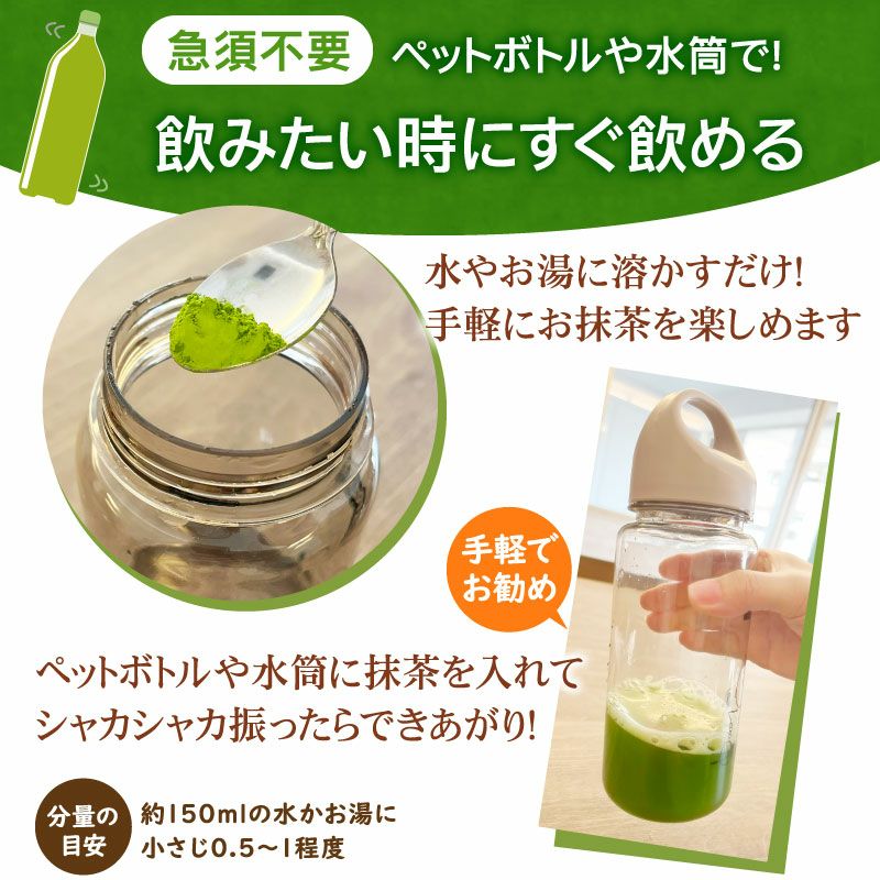 旨みと甘みが強く、渋み・苦味が少ない高級抹茶。お茶の旨みと栄養を丸ごといただくことができます。お湯を注いでお抹茶に、豆乳や甘酒に混ぜるだけで健康に気遣ったドリンクとしてお楽しみいただけます。